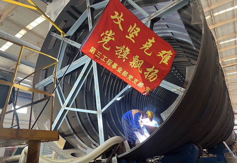 目前,魯西集團40萬噸/年有機硅項目的建設施工正在緊張有序進行中,二元塔作為項目的核心設備進入了制作的關鍵期,該設備共有三臺,單臺高度90m,直徑6.6m,重量達1000噸,且設備內部結構復雜,焊接工作量大。由于設備體積大,無法在廠房內完成整體制作,為保證設備制作質量,充分考慮后期運輸安裝等因素,技術部門反復研討論證,首次采用了“車間預制+現場組焊”的方式進行大型高塔設備制作。基層黨支部抽調精干力量,成立黨員突擊隊,一部分在車間加班加點對二元塔預制,另一部分到項目現場進行設備底部裙座環縫合口焊接、外口焊接等工作。廣大黨員克服戰高溫斗酷暑,認真落實各項安全措施和質量管控要求,為設備制作保質保量按期完成奠定了基礎。